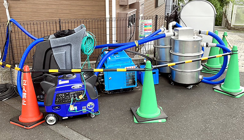 現場は、住宅が立ち並ぶエリア。大型洗浄機の設置場所を設ける余裕はありません。通常は、この時点で高圧洗浄作業を断念せざるを得ないでしょう。しかし、小スペースでも機器を使用できる『改良型高圧洗浄機』であれば、設置及び使用が可能となります。